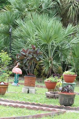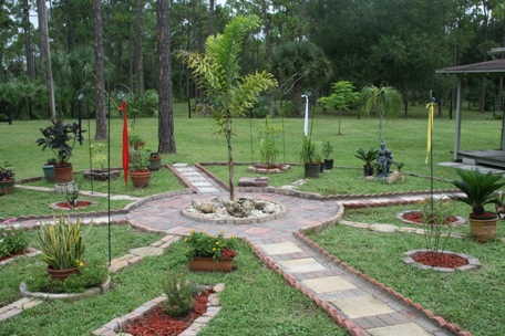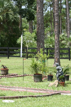 Yellow Bells are Beautiful FlowersI am trying this plant out in a pot just to see if it does well. If so, I will transplant it into the ground and provide a larger trellis.This is an overview of the west quarter of the circle.Another view from the west.This is one of the many lizards that visit my garden, here she is right underneath the Garden Fairy.As I was sitting on the front porch of the guest cottage, after working hard in the garden, I was rehydrating and admiring and I guess this little visitor was as well.Succulents in Bloom. I planted this succulent and within on week it shot up a beautiful spike of flowers, pretty cool. Eh?This is an overview of the south quarter of the wheel.Tabebuia Caraiba or Silver Trumpet tree has leaves that are green on the top side and silver on the bottom. And in March and April has beautiful large yellow blossoms. When my beloved Belle was in her last days the Trumpet trees were blooming so in her memory I planted two just past my Medicine wheel garden.This potted sego palm just got new growth, I will plant her in the ground next spring.I planted this Royal Poinciana tree two years ago. I have a wonderful tree in the front yard that is about forty feet tall and forty feet across and has the most beautiful orange flowers in the summer. The one in the front was severely damaged by Hurricane Wilma in 2005, but I refused to have it taken down. I told everyone that she would come back and she has not proven me wrong. Finally this summer she has produced the most beautiful array of flowers and wondrous seed pods that all the doubters are eating their words now. So I planted a young one because I read that these trees would bloom more if there were two. This spring there was an incredibly late freeze and my poor little tree lost all of its leaves. I did not give up hope and watered and smudged and talked to her and look, she is in full leaf splendor!Purple Showers, Mexican Petunia. I planted a very small plant to see if it would like this place. If it does the bush could grow to as large as four feet!Purple Queen and Mexican Petunia. The purple queen in the front NEEDS to be in a pot. If I were to plant this in the ground here in Florida it would become and invasive taker-overer type plant. So I admire the beautiful purple color and that it is a “butterfly plant” but she must be kept contained for the good of the local natives.Persian Shield. I do not know that much about this plant so I potted it just to be sure it would survive and wait until I can do some more research on its invasive qualities.Pentas bring lots of butterflies and beesI just love orchids!Orchids bloom about every six months. This is one of two spikes on this orchid in bloom!The North. In the north quarter I have planted night blooming jasmine in the ground with a wonderful trellis. There is a statue of a mother and her two children, many potted ponytail and sego palms and a few “Bonsai” Ficus plants.The Money Tree. I had to place the Money tree in the west quarter because the root structure and eventual height of the tree dictated that it be at least forty feet away from my House and foundation. It has grown fantastically there, so all is goodMexican Peturnia. Well I had this pot aand it looked good where it was in the circle so I planted this plant. I love the purple blossoms and the bees do as well.Mexican Heather. I am trying new flowers in the garden to see what will grow the best.After a very hard and freezing winter here in South Florida, I cleaned up and trimmed back plants, took out the poor ones that didn’t make it, and put in a few new ones. Now I will meditate and wait to see which ones make a come-back, then I will replace the ones that don’t.The Cottage you see in the background is where my guests, like Anne, Barbara and Susan stay when they visit Florida.I have worked hard the past few weeks in the garden and I am quite proud of my accomplishments.Just another angle on the garden!My Medicine wheel garden is about thirty feet across. I just added the Foxtail Palm in the middle of the circle. This garden sits outside my studio window so it is a constant source of inspiration for me.Marigolds, Lavender and Rosemary. In the south quarter of the garden.I have my “Garden Fairy” and sculpture made from pavers, cinder blocks and rocks that I found on my five acre property. I have succulents in pots to see if they like this area.I really do not know what these little beauties are called, but here we call them “Florida Snow”. After a rain they bloom low in the grass and when you look over an open expanse of them they look like a snow field. The closest we will come to a snow field in Florida!My cat figures keep watch over the garden, plants, and fountain.Yes Butterflies and bees love this plant as well.Butterfly Bush. This is the flower from the butterfly bush. When I was in the garden center all the butterflies were flitting about this plant to I brought her home.Here is proof that the butterflies LOVE this plant!Bromeliads do very well in my Orchid Garden, in a natural setting they do not get quite the same color as the “forced” bloom of Bromeliads in the store, but I love them for their “natural” effort.